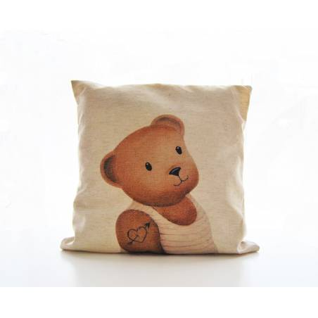 Le coussin nounours "Marcel" est tatoué mais ce n'est pas un dur, il a le cœur tendre et adore que des petits bras l'entoure pour lui faire des gros câlins!