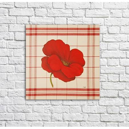 Coquelicot peint sur une véritable toile de torchon à carreaux rouges fond écru. Décoration idéale pour cuisine, salle à manger.